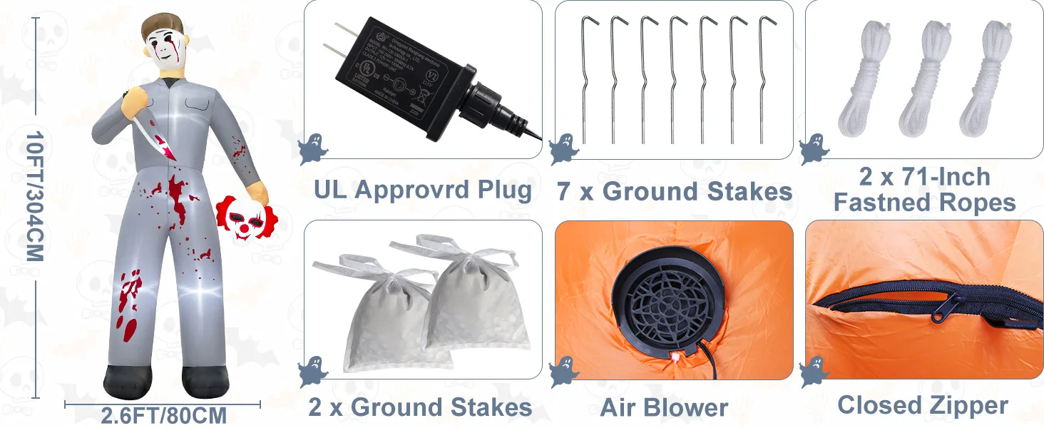 【10FT Halloween Outdoor Inflatables】Designed at 10 feet in height, these giant Halloween inflatables transform your yard into a creepy haunted house, featuring a serial killer blow up holding a knife and a scary mask. What's more, the blower, adapter, power lines, ground stakes and wind ropes that everything needed for setup are all included in the package.