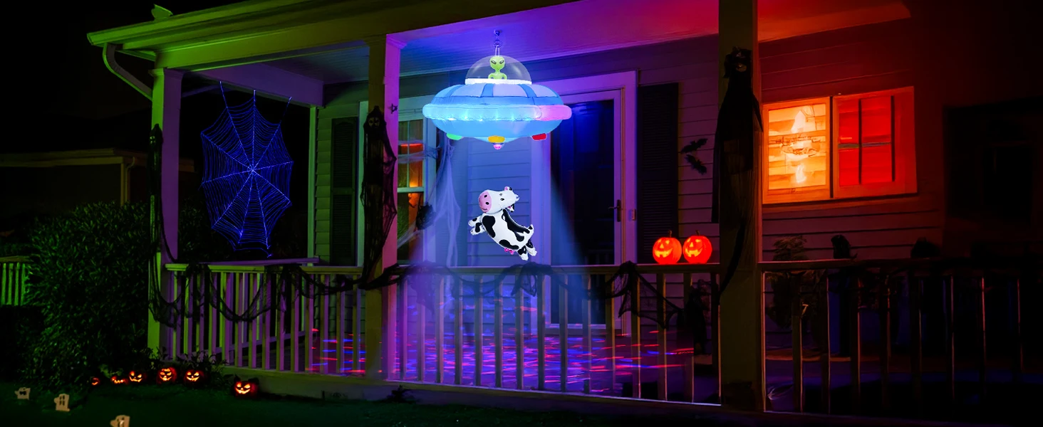 Elevate your Halloween decor with the Halloween decorations outdoor inflatables. Featuring an alien spaceship and a thrilling scene of cows being abducted, this inflatable adds fun and excitement to your yard, porch, or lawn.