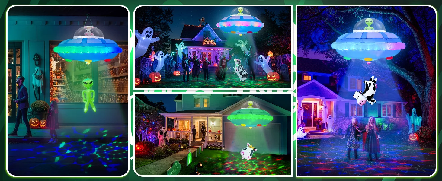 Creative Halloween Decoration Outdoor Inflatable: The Halloween inflatables add an extra layer of fun and excitement to your Halloween decor. Featuring a UFO spaceship, an alien, and three cow balloons, this inflatable creates an engaging scene of alien abduction, perfect for your outdoor lawn, yard, or porch