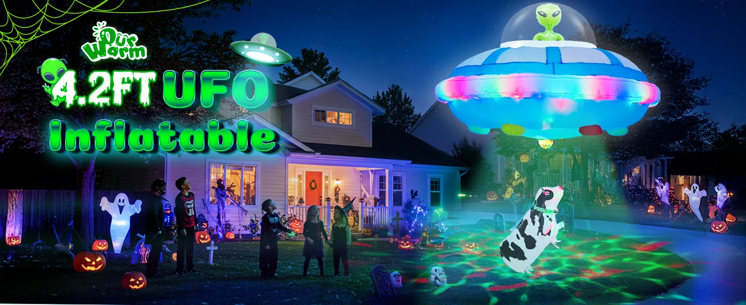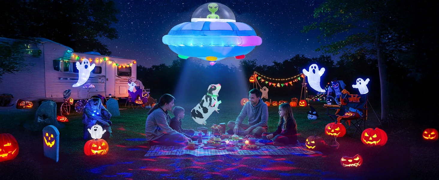 Dynamic LED Lighting: Our blow up Halloween decorations are equipped with dazzling, energy-efficient, dynamic LED lights. Featuring different lighting effects that rotate within the spaceship, it creates a spectacular visual effect that makes your yard stand out at night, drawing attention from all angles
