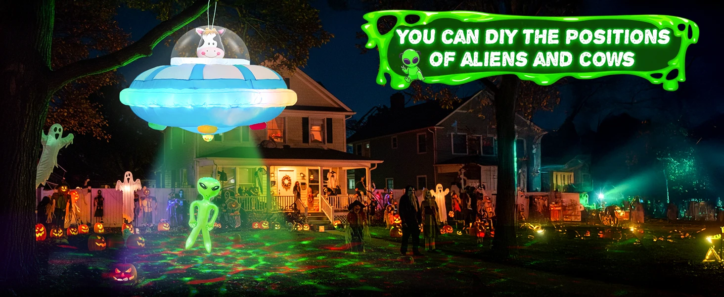 With the openable zipper, you can adjust the positions of the cow and alien for a personalized abduction scene. Hang alien inflatable on tree branches, eaves, or anywhere else to make your Halloween display truly one-of-a-kind.